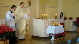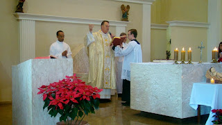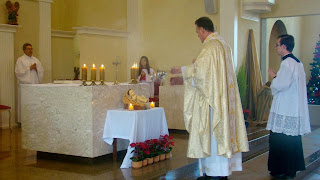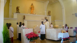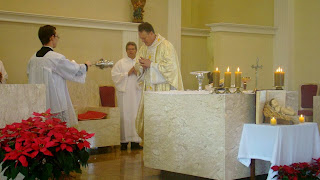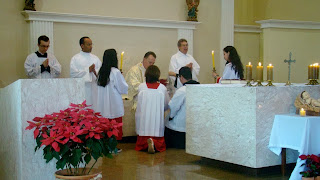 Destacamos a imagem do Menino Jesus e o Evangeliário colocados diante do altar e o arranjo beneditino.