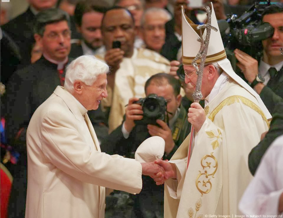 | Papa Bento retira o solidéu para saudar Francisco |